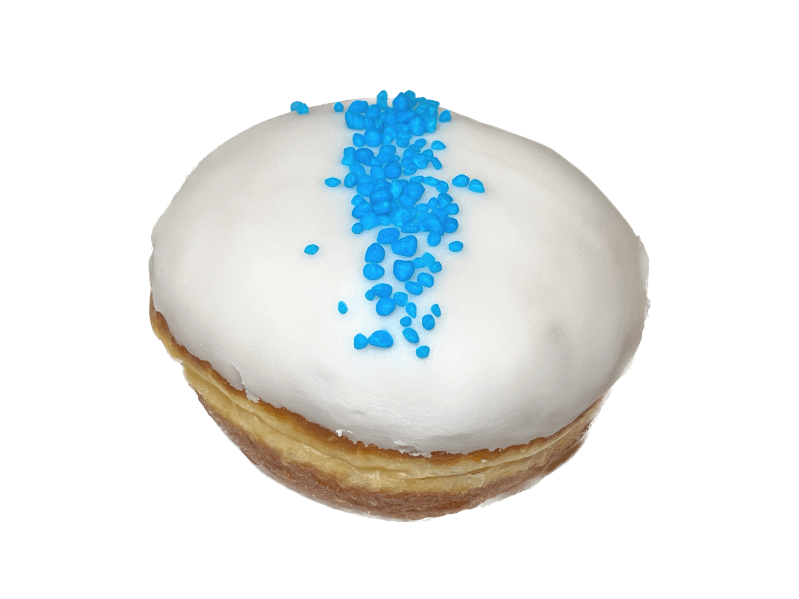 VETEmjöl, glasyr [socker, vatten, glukossirap, emulgeringsmedel E471, konsistensmedels (E406, E410)], hallonsylt [socker, hallon, vatten, konsistensmedel E440, surhetsreglerande medel E330, konserveringsmedel E202), ÄGG, vatten, margarin (rapsolja, vatten, emulgeringsmedel E471, salt, arom), palmolja, socker, blå pärlor [socker, glukossirap, arom, ytbehandlingsmedel (E904, bivax), solrosolja, färg E131], jäst, joderat salt, emulgeringsmedels (E481, E472e), mjölbehandlingsmedel E300.